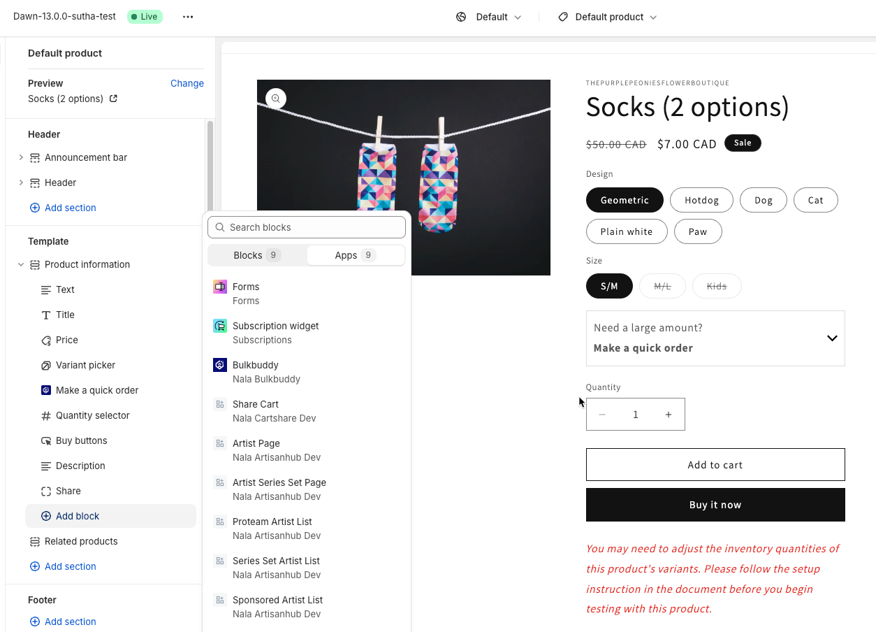 In the left menu, under Product Information, opt to 'add block'. Look for BulkBuddy, select the BulkBuddy block provided by Nala BulkBuddy App, and adjust its position so it sits between the price and variant picker blocks.
