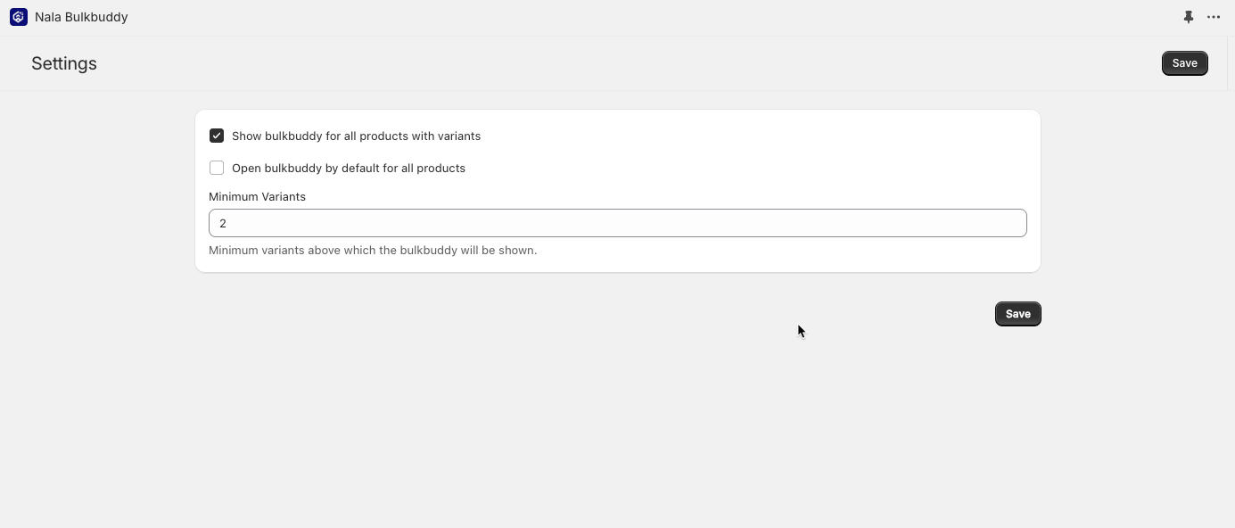 For displaying BulkBuddy exclusively on products with at least 4 variants, input '4' in the 'Minimum Variants' field. Products with fewer than 4 variants will not feature the BulkBuddy option.