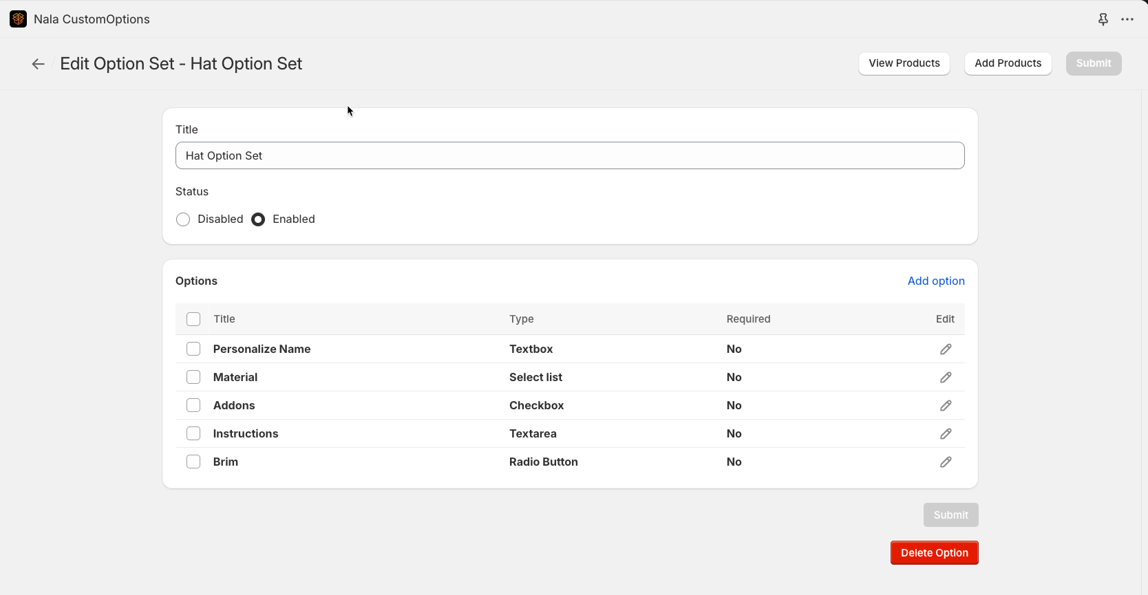 - Create a Custom Option Set: Begin by setting up a custom option set that will group all the options you want to associate with a product.